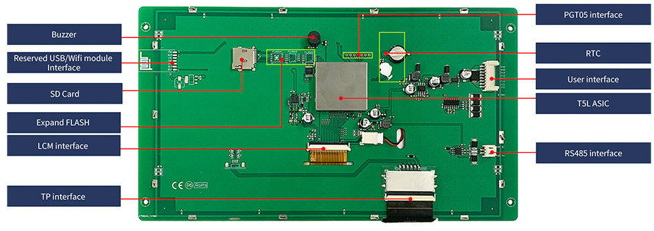 The screens can fully function specific applications “as is”. Just add power.Or you can communicate to and from the display with a PC via RS-232 / USB or an with an embedded micro controller via serial data orvia RS-232 using command strings.